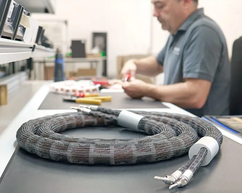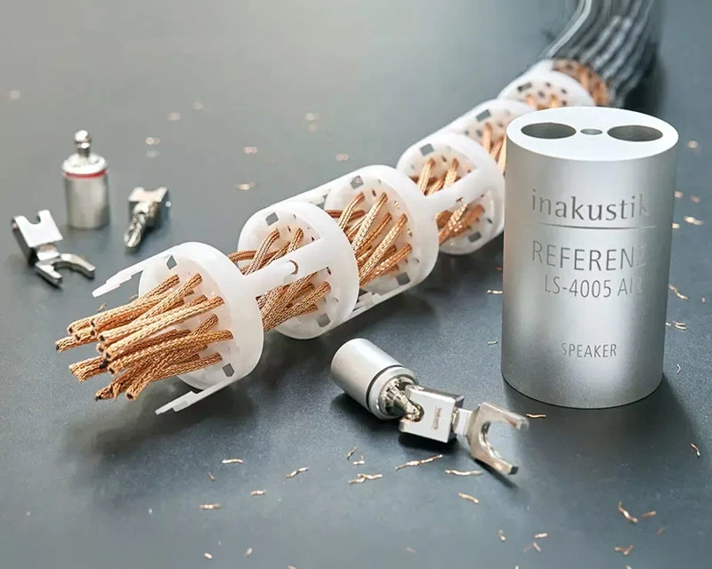 The structure, shielding, and materials used have a decisive impact on the quality of cables. In addition to the cable architecture, the company places particular emphasis on high-quality materials. For the production of its copper cables, it uses the purest, best-conducting copper. The copper wire, which is cast to a thickness of about 10 millimetres and wound onto spools, is tested for purity in rigorous quality tests. The copper wire is then drawn to the required diameter in several stages at a German wire drawing plant and further processed in a German cable factory. The cable is then finished and assembled at the Inakustik factory. For the production of reference AIR cables, the company uses only selected high-purity oxygen-free copper.